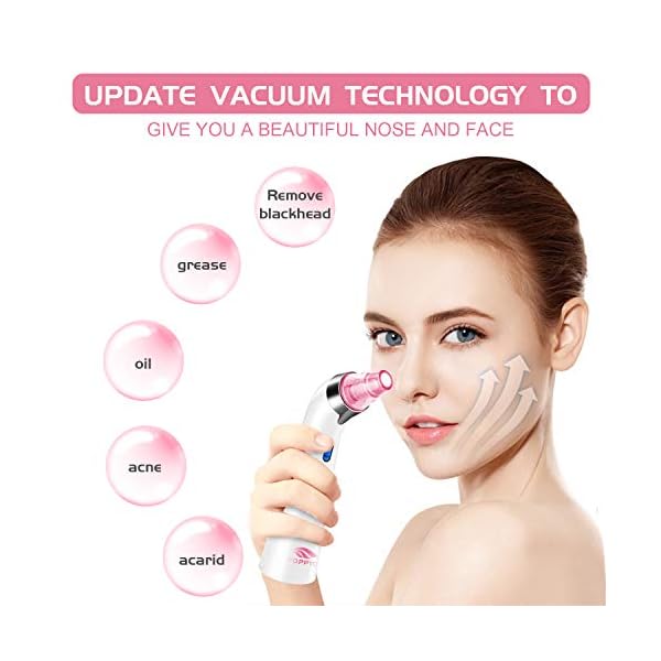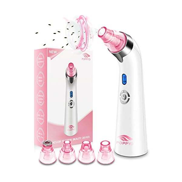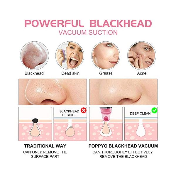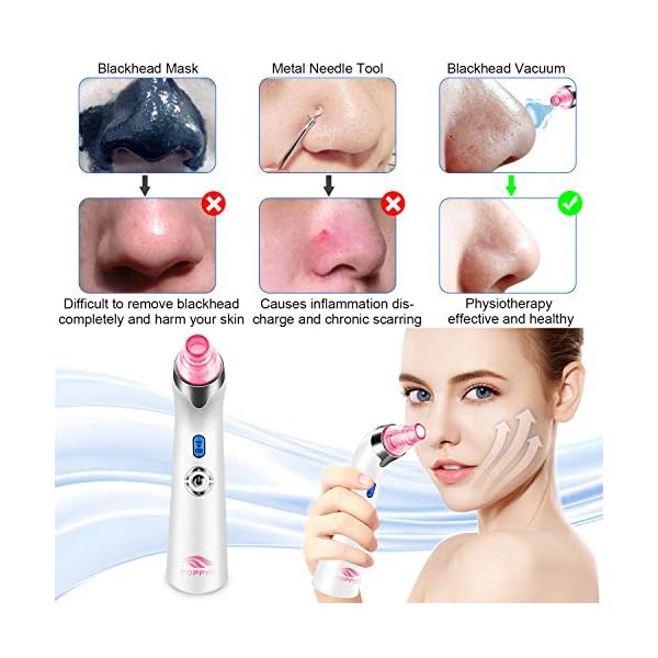 【MULTI-FUNCTIONAL & PROFESSIONAL】The POPPYO pore vacuum is designed for a variety of skin types. Use vacuum absorption technique from level 1 to level 3 suction forces, level 1 is for sensitive and dry skin, level 2-3 are for neutral skin, level 4-5 are for mixed and oily skin. Meanwhile, it has 4 suction heads for different skin conditions: Cleans up blackhead, removes dirt grease, reduces dead skin and fine lines, massage and tighten the skin.