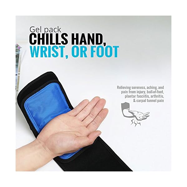 Gel pack chills hand, wrist, or foot–relieving soreness, aching, and pain from injury, ball-of-foot, plantar fasciitis, arthritis, & carpal tunnel pain.