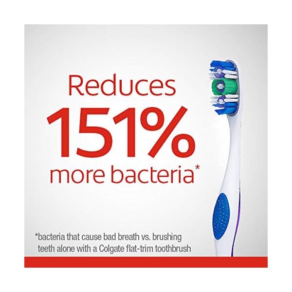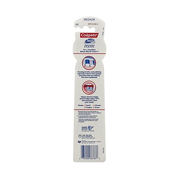 The Colgate 360⁰ adult full head toothbrush is designed with medium cleaning bristles and polishing cups that help remove more plaque and stains than an ordinary flat-trim toothbrush. This manual toothbrush has an ergonomic handle design and a unique cheek & tongue cleaner that helps reduce 151% more bacteria that cause bad breath versus brushing teeth alone with an ordinary flat-trim toothbrush.