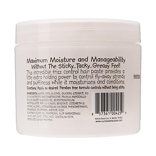 Curly kids frizz control paste, developed for curly, kinky, coily and frizzy hair. Mixed hair Haircare. This product is amazing when a little extra control and definition is desired. Maximum moisture and manageability without the sticky, tacky, greasy feel! This incredible frizz control hair paste provides a little extra holding power to control fly-away strands and puffiness while it moisturizes and conditions.