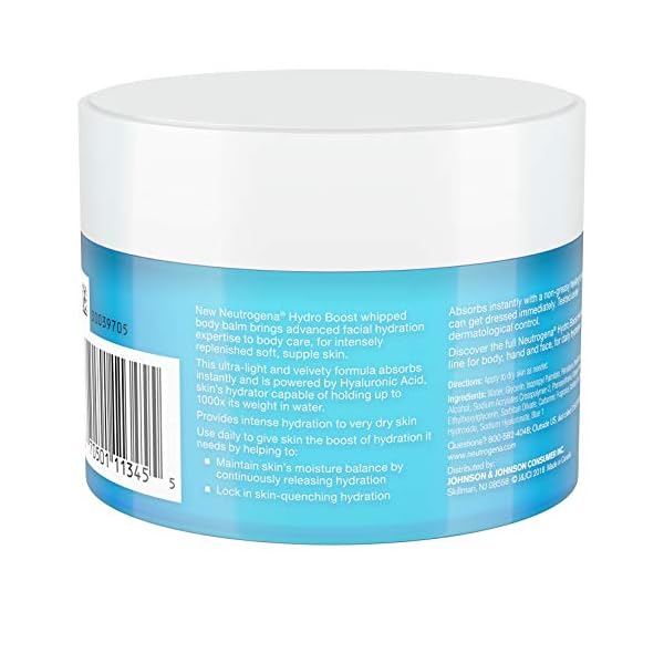 Get soft, supple skin with Neutrogena Hydrating Hydro Boost Whipped Body Balm. Designed for dry to extra-dry skin, this moisturizing body balm provides intense moisture, leaving your skin feeling soft and replenished. From the number-one best-selling facial moisturizer brand, this luxurious, velvety whipped body balm is formulated with hyaluronic acid to boost skin cells’ hydration and then lock it in. The ultra-lightweight, non-greasy balm is fast absorbing, dermatologist tested and paraben-free. Use whipped body balm daily to retain hydration and help improve the look and feel of dry skin over time.