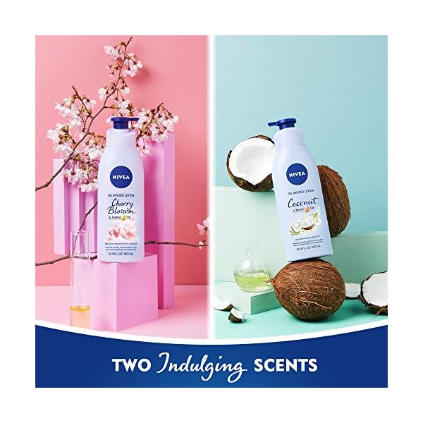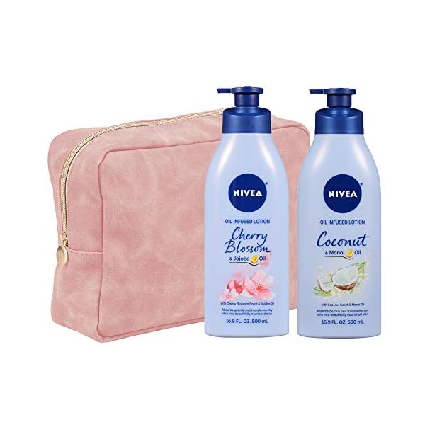 Variety skin care gift set comes with: Nivea Coconut & Monoi Oil infused body lotion (16.9 oz) and Nivea Cherry Blossom and jojoba oil infused body lotion (16.9 oz)