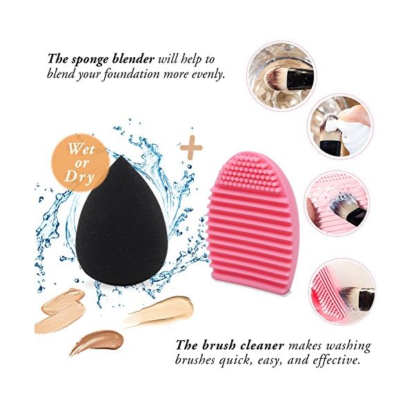 FULL MAKEUP BRUSH SET WITH FREE SPONGE&CLEANER: A variety of 12pcs makeup brushes meets all your needs for foundation brush, powder brush, blush brush, eyeshadow brush, concealer brush, eyeliner and eyebrow brush. Come with a free sponge blender: Wet the sponge with water, squeeze out excess liquid, and bounce your makeup product across your face for a flawless look. A free Silicone Brush Cleaner: Very useful tool to cleaning various of your makeup brush set so that to avoid some facial problem.